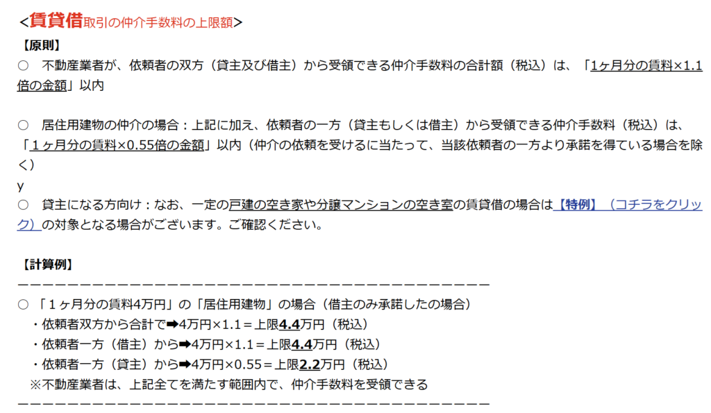 | 仲介手数料(0.55ヶ月以上の場合) | 仲介手数料の基本は貸主と借主両者からあわせて、家賃の1.1倍しか請求してはダメ+片方からは家賃の0.55倍までしか請求しては行けないルールです。 |