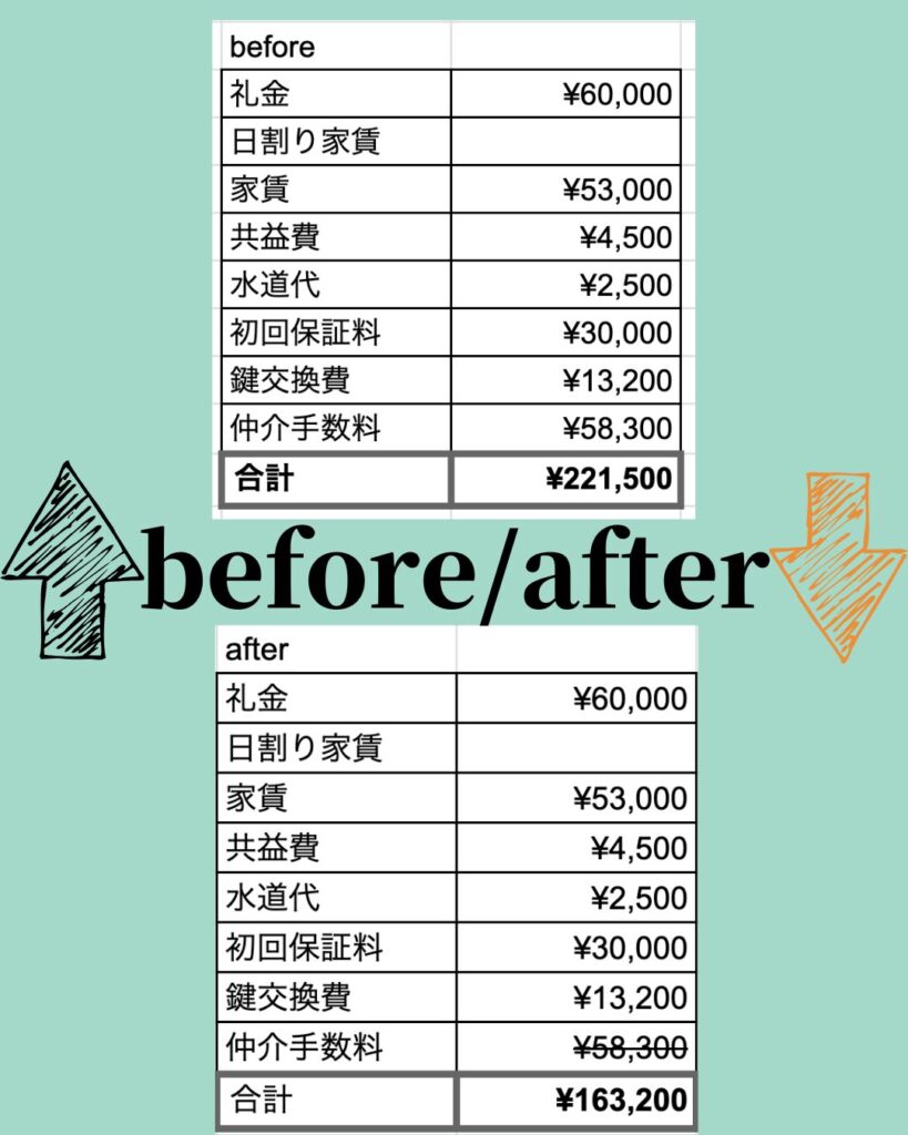 6万の家賃の部屋だったので、家賃のj3.5ヶ月分ぐらいで住めたよ!